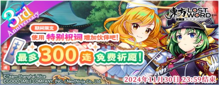 亲爱的乡民们!最新一期活动预告来袭~快来与我们一起参与吧~ 【三周年纪念特典!泳装特别祝词】泳装特别祝词,可在特定祝词祈愿池进行祈愿。小概率能与[生活还算如意的富婆姐妹的姐姐]依神紫苑成为伙伴。开始日期:2024年10月1日 02:00结束日期:2024年10月15日 23:59 ※泳装特别祝词将在活动结束后失效,请确保在活动期间内使用(失效后仍会存在于道具栏中)。※使用泳装特别