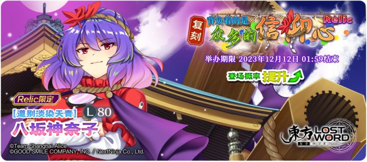 Relic限定祈愿【复刻 背负着的是众多的信仰心】与FES限定祈愿【夺走阳光的惩罚】现已开启!✨活动时间:2023年12月5日 02:00至2023年12月12日 01:59✨角色概率UP:「道别淡染天青 八坂神奈子」登场概率提升的Relic限定祈愿! 「复刻 背负着的是众多的信仰心 Relic」会同时开放特惠阶段祈愿!阶段祈愿分为1~5阶段,每阶段都相当于1次神结晶十连祈愿。【各阶段
