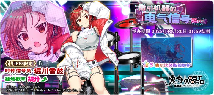 亲爱的乡民们!最新一期活动预告来袭~快来与我们一起参与吧~ 【指引机器的电气信号 超FES】时钟信号员 堀川雷鼓登场概率提升的超FES限定祈愿!开始日期:2025年12月23日 02:00结束日期:2025年12月30日 01:59 ※「指引机器的电气信号 超FES」需要交换P250才能交换「时钟信号员 堀川雷鼓」。※「时钟信号员 堀川雷鼓」需要使用同名伙伴或者「天之替身」进行界限