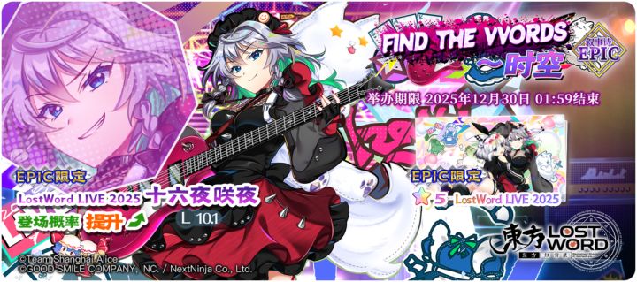 【FIND THE VVORDS〜时空 EPIC】[LostWord LIVE 2025]十六夜咲夜登场概率提升的EPIC限定祈愿!开始日期:2025年12月16日 02:00结束日期:2025年12月30日 01:59 ※「LostWord LIVE 2025 十六夜咲夜」是仅在EPIC限定祈愿中登场的角色。※「FIND THE VVORDS〜时空 EPIC」中需要交换P400才能交