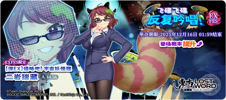 【飞碟飞碟 反复吟唱! EXFES】[深EX]侵略吧!宇宙妖怪狸 二岩猯藏登场概率提升的EXFES限定祈愿!开始日期:2025年12月9日 02:00结束日期:2025年12月16日 01:59 ※「[深EX]侵略吧!宇宙妖怪狸 二岩猯藏」是仅在EXFES限定祈愿中登场的角色。※「飞碟飞碟 反复吟唱! EXFES」中需要交换P350才能交换「[深EX]侵略吧!宇宙妖怪狸 二岩猯藏」。※