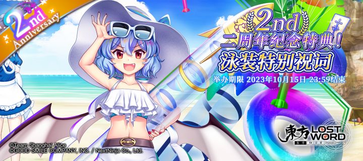 亲爱的乡民们!最新一期活动预告来袭~快来与我们一起参与吧~ 【2周年纪念特典!泳装特别祝词】活动时间:2023年10月1日 02:00至2023年10月15日 01:59泳装特别祝词,可在特定祝词祈愿池进行祈愿。小概率能与[对抗流水与阳光的吸血鬼]蕾米莉亚·斯卡雷特成为伙伴。 ※泳装特别祝词将在活动结束后会失效,请确保在活动期间内使用(失效后仍会存在于道具栏中)。※使用泳装特别祝词
