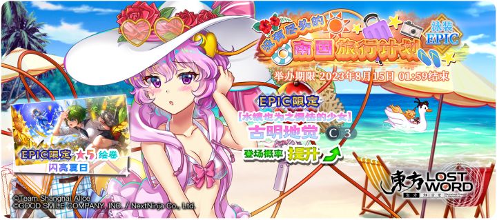 EPIC限定祈愿【没有尽头的南国旅行计划】、超FES限定祈愿【复刻 鲜红黑暗的魔界执事】与FES限定祈愿【只是在湖上玩耍了一下而已】现已开启!✨活动时间:2023年8月1日 02:00至2023年8月15日 01:59✨角色概率UP:「水镜也为之惧怯的少女 古明地觉」登场概率提升的EPIC限定祈愿!※「水镜也为之惧怯的少女 古明地觉」是仅在EPIC限定祈愿中登场的角色。※「没有尽头的南国旅