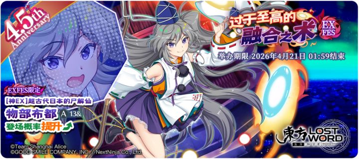 【过于渴望的宇宙飞行 EXFES】[绀-完美无瑕EX]住在山上的过于奇迹的现人神 东风谷早苗登场概率提升的EXFES限定祈愿!开始日期:2026年4月21日 02:00结束日期:2026年4月28日 01:59 ※「[绀-完美无瑕EX]住在山上的过于奇迹的现人神 东风谷早苗」是仅在EXFES限定祈愿中登场的角色。※「过于渴望的宇宙飞行 EXFES」中需要交换P350才能交换「[绀-完美