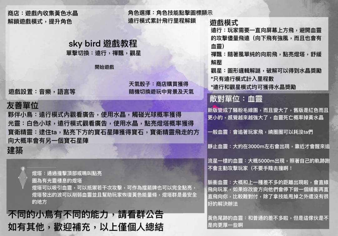 天之鸟 休闲类 游戏概况:分为三类 远行、禅飘(受伤解锁)、观星(发现星系解锁) 接下来一一说明 *远行 规则:鸟在天上飞,血灵后面追,鸟的鸣叫有不同的用处,但都可以使灯塔 被激活。(其他用处请见游戏中) 模式适合刷距离,凑历史 •血灵 会对鸟造成伤害(撞上后)有不同分类,详情参考其他帖子,有的 •光灵 光之白鸟、九天玄鸟及灯塔出产物,形如白色光球。 用处:击打血灵(随缘) 点亮灯塔(靠近自动)