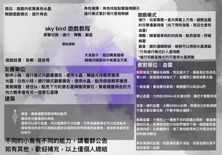 最新版教程萌新可以食用,圖內為個人總結,歡迎補充小鳥能力:綠色-緩慢回復一格生命值黃色-緩慢回復黃色技能條藍色-幫助你攻擊血靈粉(群裡也有說是橙色)-可以去撿起黃水晶紫色-和你一起鳴叫