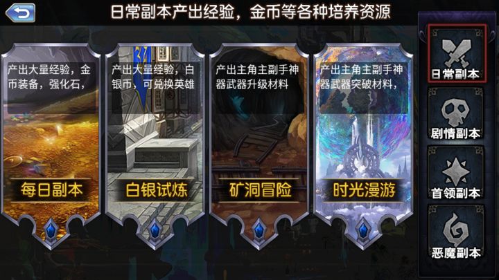 【副本】包含日常副本、剧情副本、首领副本、恶魔副本。以下介绍日常副本。日常副本产出大量经验,金币等各种培养资源。日常副本有每日副本,白银试炼、矿洞冒险,时光漫游四大玩法每日副本产出大量经验,金币装备,强化石。其中,每日副本又分为经验副本、装备副本、金币副本、材料副本。白银试炼产出大量经验,白银币,可用于兑换英雄。 矿洞冒险产出主角主副手神器武器升级材料。 时光漫游产出主角主副手神器武器突