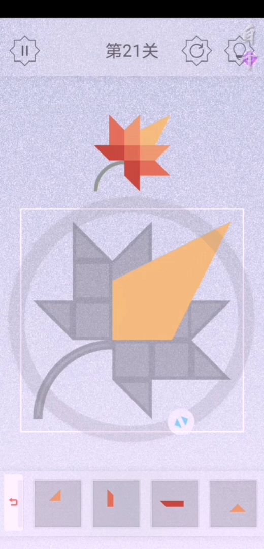 在论坛里大致翻了一下,有很多直接通关的教程,却没有如何做出的思维路径。秉承着“授人以鱼不如授人以渔”的想法,我把自己的通关思路写了出来。 首先将零件大致分为三类,第一类为圆形,第二类为伞形,第三类为隔板。 首先观察例图,和给出的零件进行对比。 注意到图片中出现很多叶状图形。从给出的零件看,这些地方只能是圆形与伞形的叠加。叶状图形的颜色取决于下方圆形的颜色。 于是我们可以比较容易分析出圆形与伞形大致