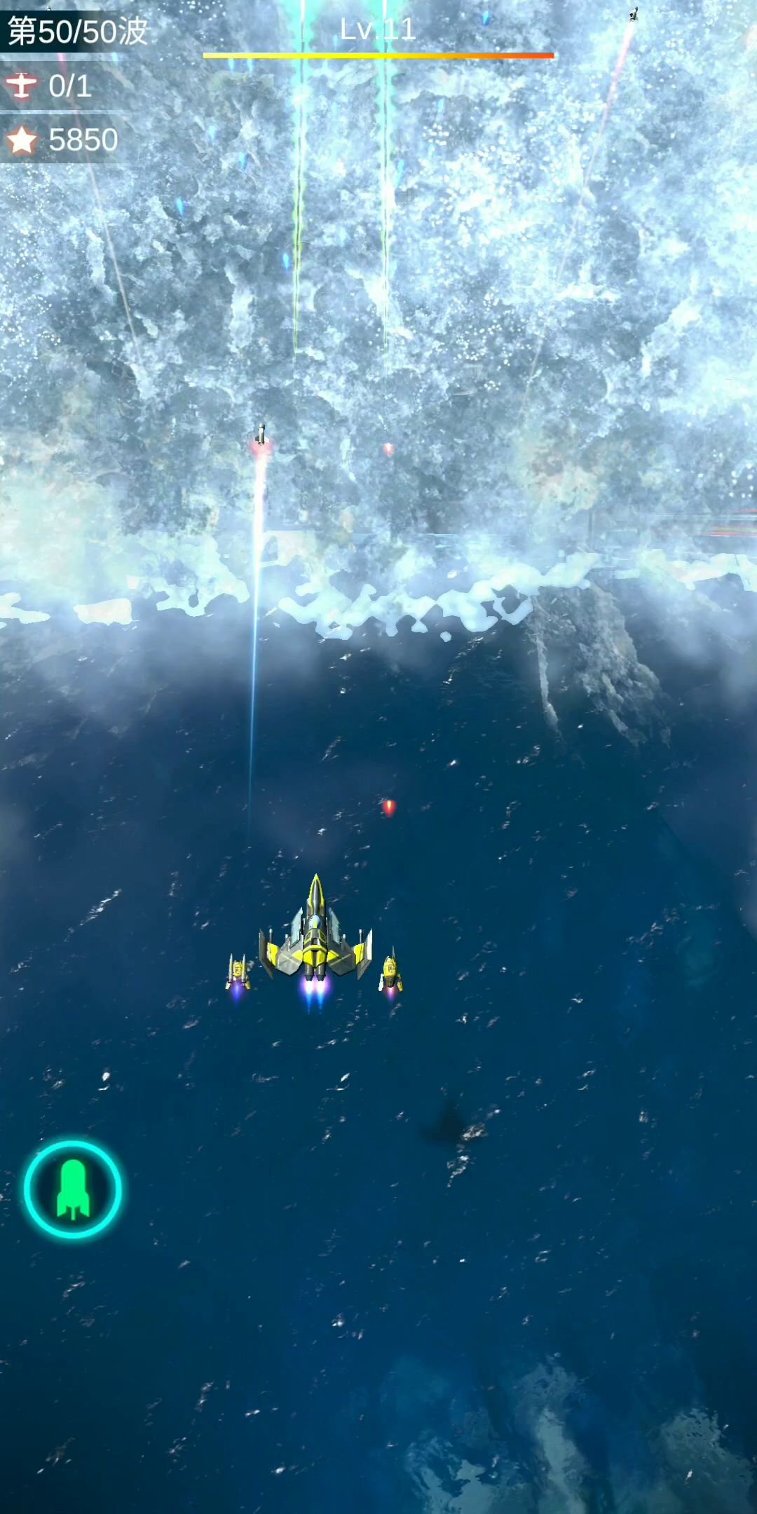 和第十九关一样,小怪伤害好高! 打法和第十三关一样,也许是我脸黑,超多激光炮台。 第十三关的BOSS,原来是机头会射两道蓝激光、旋翼处会喷一圈子弹的直升机BOSS。改版后变成三面脸了。 【三面人有护盾,带盾时打不动的】 蓝脸:小心带瞄准的激光炮(眼睛),要躲的离瞄准红线远远的、嘴巴是超级激光炮(直喷)。 黄脸:小心彩圈的火箭炮、躲着点弹道导弹。 红脸:小心嘴巴上喷出来的三个泡泡。 【打到红脸时,战机操控点要离战机远点,方便躲子弹(注意看我打到这里时的操控位置点),按在战机的右边2~3CM最好,方便泡泡弹出来时,往最边上躲(左上角、右上角)。】