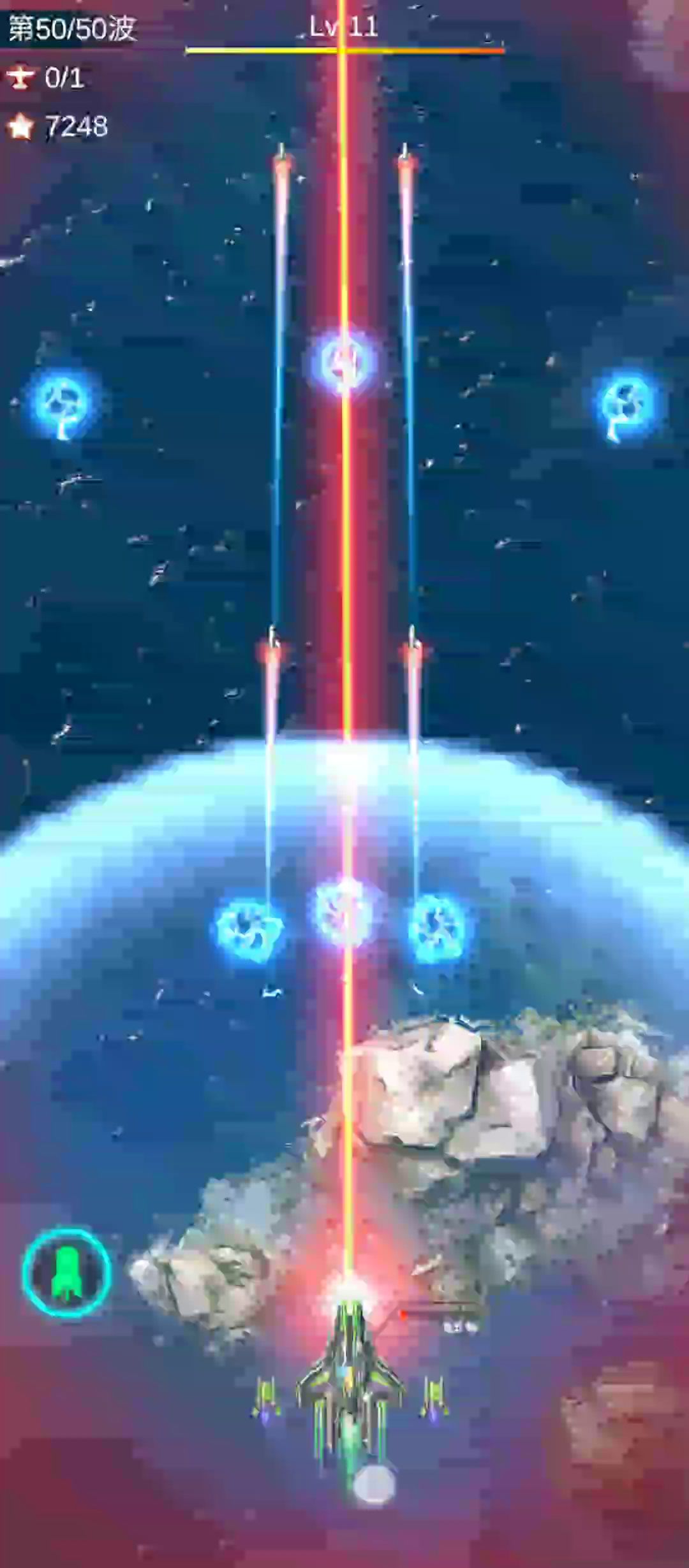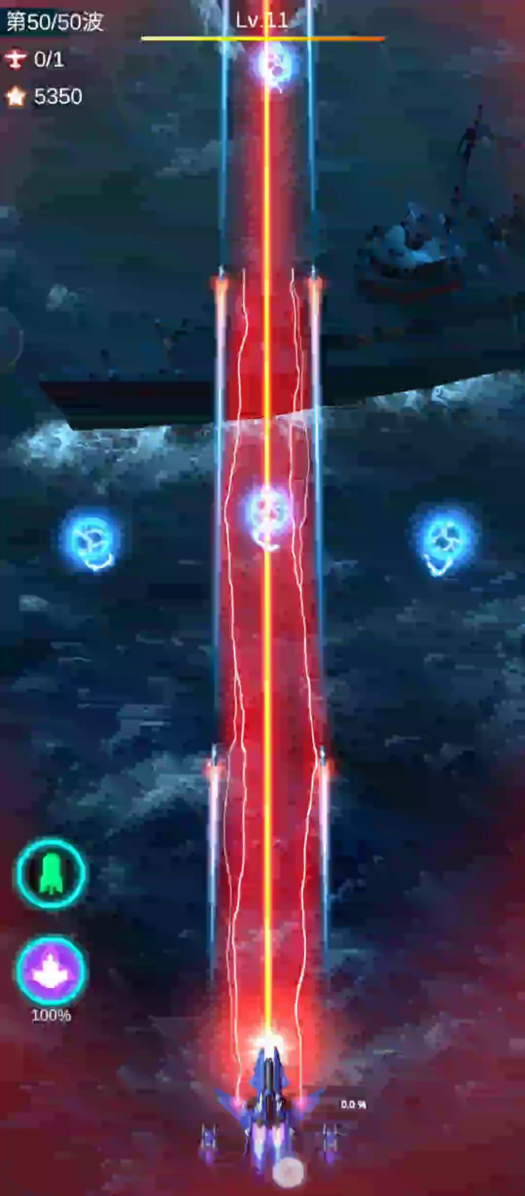 【视频中间为复活用的【广而告之】】 1.7.25版,其实,就是谷歌改版后的。 新旧版的有所不同。 女妖战机:6120 震荡护甲:15740 宝石加血:320 加上别的战机特定等级、星级的加血。 总血量:27482 最后一波次的导弹伤害没试,没血了,应该没区别吧,毕竟之前打的时候,够血时挨一下也不会死。 最怕的是潜艇头、尾的各两座火箭炮台,每次各打2枚,一次命中两枚,就是140%的血量。 前、后两边的六管弹道导弹的攻击也一样,约70%的血量。 血够的,可以挨一枚。