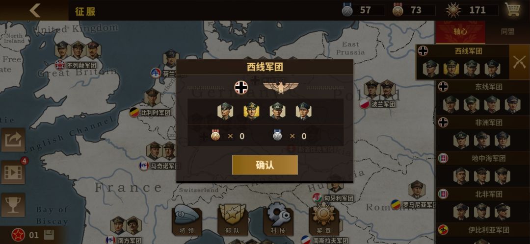 首先右上角三种货币 第一种银章 突击勋章 帝国奖章每日送16枚 可用来强化特种部队 特种部队游戏内使用金币激活部队特殊属性 第二种金章 骑士勋章 十字勋章每日获得六枚 可用来强化科技 科技直接作用于游戏内部队属性提高 第三种 勋章 用于购买将领 或直接兑换金章银章 来源 氪金 成就 广告 战役上指定将领可随机获得一枚勋章 爆率较低 具体待测 战役界面 这里我称之为战区 每个战区包含多个战役 带星号