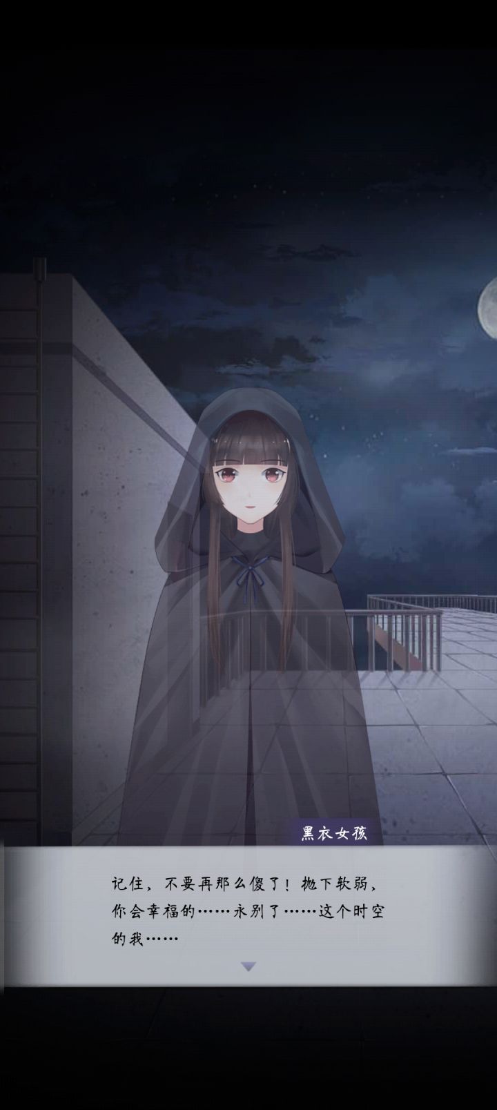 ——————(剧透警告⚠️⚠️⚠️)———————整个事件的核心,是女主因为遭受了校园欺凌所以选择以跳楼的方式来逃避一切。这个其实我从开始报纸上的模糊的人物剪影跟女主的立绘有些相似时还又女主当时所说的话就大概猜出来了,然后我接下来在想的就是,黑衣女孩究竟是什么,又是精神幻想之类的戏码嘛。然后接下来你告诉我…那个黑衣女孩是平行世界来的未来的自己?(秒变科幻故事有木有)然后她还告诉现在这个女主,叶辰其实是你幻想出来的(又回归灵异故事?),信息量一时间太大,我直接选择当场懵逼。