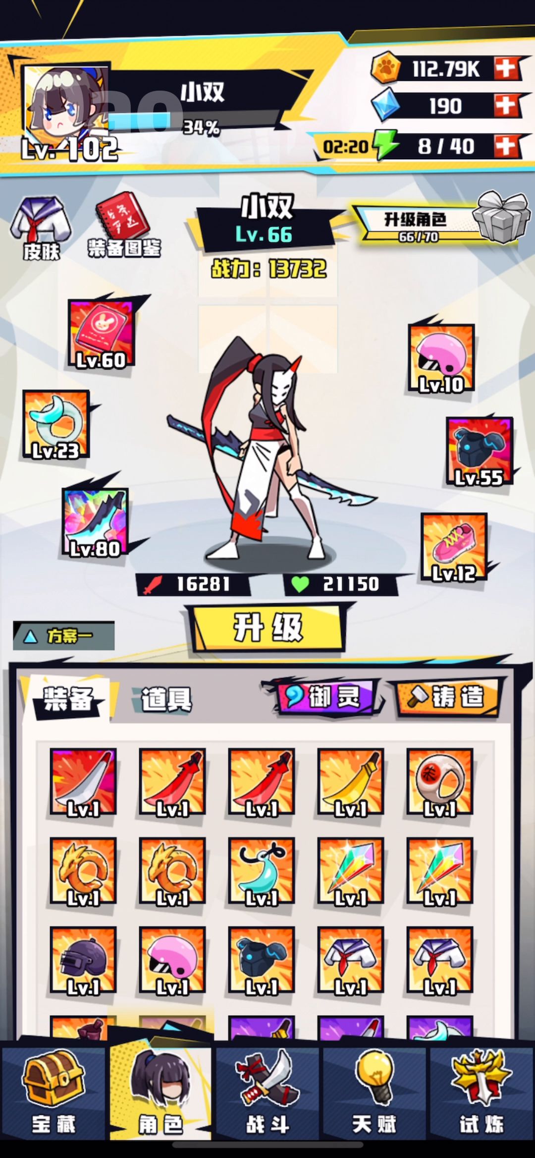 装备:黑刀(红),护照(红),月戒(橙),安全帽(橙),能量甲(红),旅游鞋(橙) 技能主要是减伤max,吸血(攻击越高吸血越多)必备;行云流水,连击如果能不断,必备;在行云流水的基础上,暴伤>奥伤>全伤 这个是微信小程序版,没熔炼和铸灵系统,很坑。