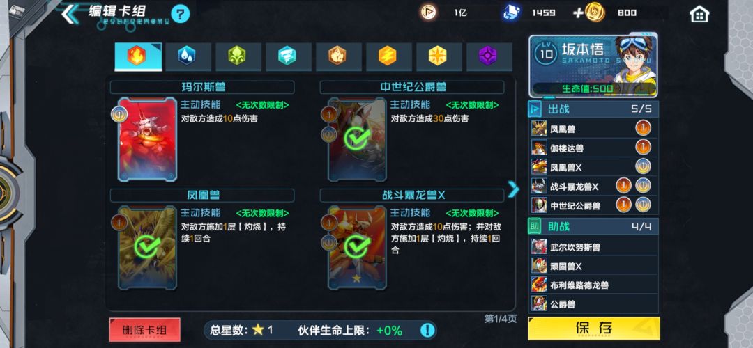 要想介绍数码宝贝的搭配,这里我要介绍下数码宝贝分的种族以及元素种类 数码宝贝分为三个种族:疫苗、病毒以及数据,三个种族相互克制,克制关系是疫苗>病毒>数据>疫苗 数码宝贝元分为火、木、土、水、风、雷、光、暗等元素 下面拿我的阵容给大家介绍下如何搭配数码宝贝 我的阵容里有战斗暴龙兽、尼普顿兽、钢铁加鲁鲁兽、海天使兽、凤凰兽 阵容特色:有输出,有治疗能力,又能控制很多关卡的治疗系BOSS回复血量以及