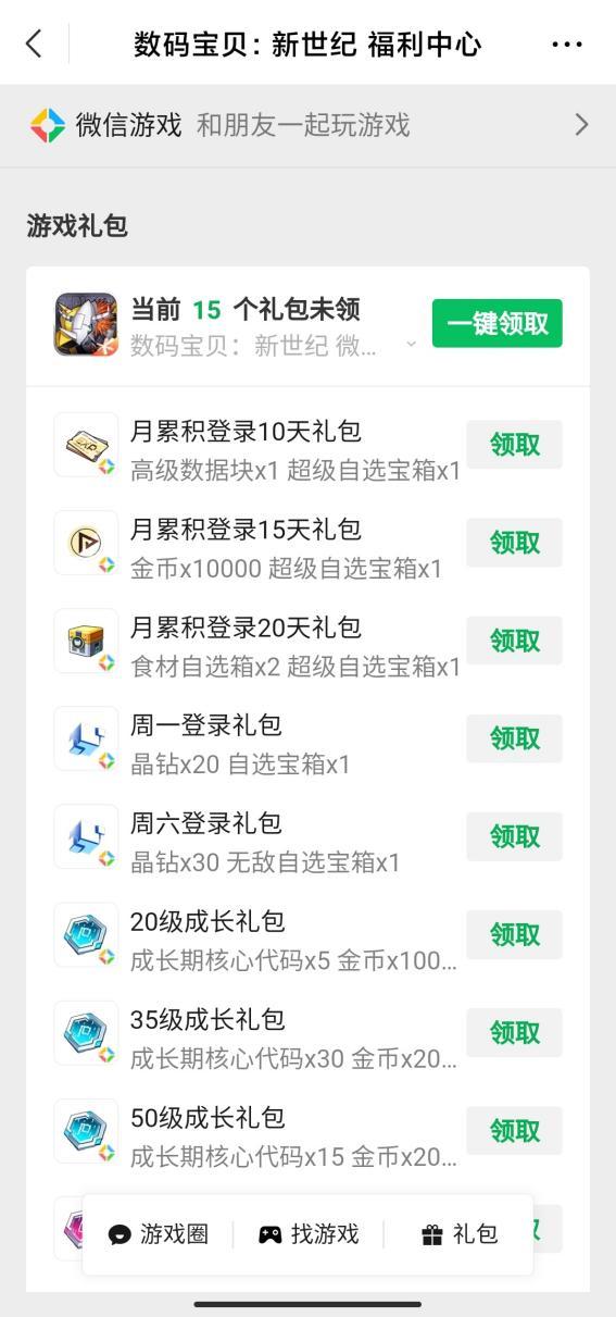 哈喽,各位看官老爷们,我是正在肝【数码宝贝】手游的攻略侠! 今天公测,相信大家都“忙坏了吧”!快来看看今天的推文是否能帮到大家! 欢迎大家关注:【数码的宝贝攻略侠】自媒体账号,攻略侠陪大家一起在游戏里碎碎念。 【关于大家最关心的礼包】 写在最前面,在微信游戏公众号里,找到【数码宝贝:新世纪】手游,下载登陆游戏,满足对应条件后,点击一键领取最多可领20个礼包! 下方为最大收益的成长路线分享! 一、保