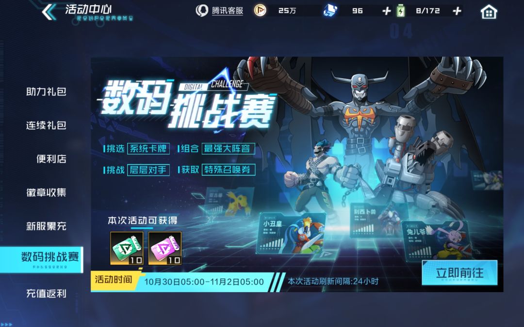 ①数码挑战赛:三天一期,隔一天后开启下一期,这个活动建议大家刷满100钻就收手(每日任务奖励100钻),这种程度基本能打四五关,奖励3-4张普通抽卡券和2-3张限定抽卡券,咱们按一周统计,则奖励*2 ②主城BOSS挑战:这个活动三天一期,间隔多久开启下一期暂不清楚(可能我没看到),一次打满200W+伤害奖励普通抽卡券3张,金币20W,钻石150,一天能打三次,打三天就能得3*3*3=27张普通抽卡