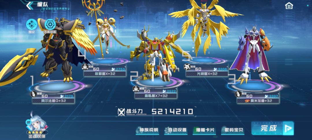 在《数码宝贝:新世纪》中初期的推图速度直接影响到发展的效率,新手玩家在初期应该选用什么样的阵容推图呢?让我们一起来了解一下吧。 阵容一:均衡火属性队 配置方案:神圣天使兽+迦楼达兽+祖顿兽+机械暴龙兽+跃升暴龙兽 前中期可选用完全体数码兽构筑阵容,其中火元素以爆发为主,更适用于前中期推图。迦楼达兽是火元素队伍的核心辅助,奥义技可提升我方攻击最高的火属性数码兽40%的伤害,在前几回合就能打出极高的伤