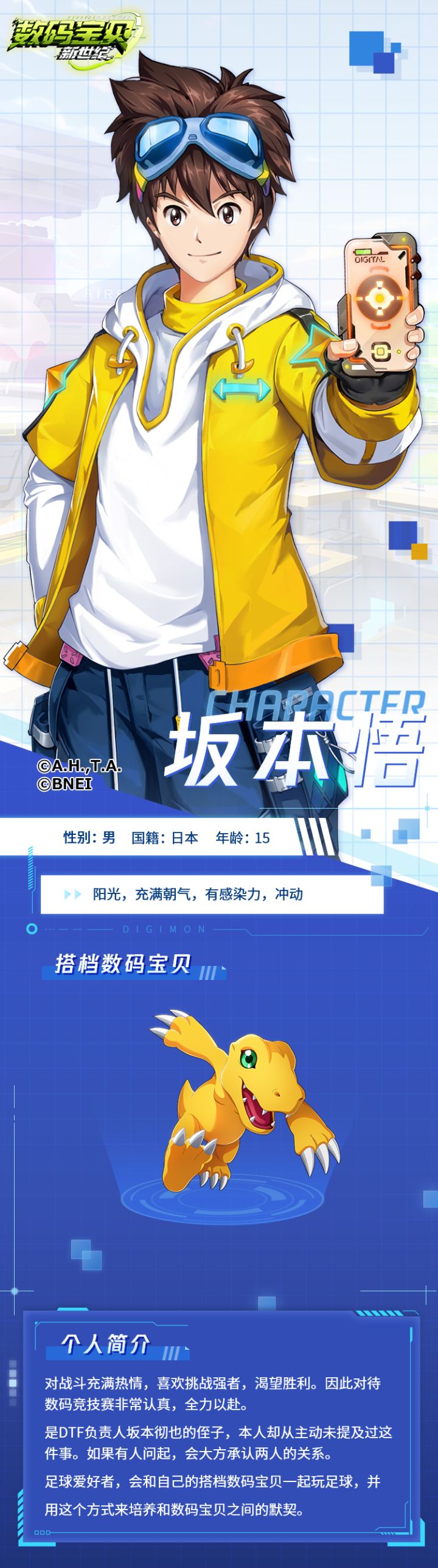 在《数码宝贝:新世纪》的世界里,伙伴是与数码宝贝一同成长、一起战斗的重要角色。同时也是各位队长担任监察员期间,需要物色考验的对象。这些伙伴为了共同的梦想来到了数码宝贝竞技赛的舞台,想知道他们各自都有着怎样的来历与爱好吗?那就通过歌子的新栏目《伙伴档案》,来认识一下他们吧!第一期歌子就先来给大家介绍一下,热爱足球、喜欢挑战强者的阳光少年——坂本悟。喜欢挑战、渴望成功队伍的核心人物——坂本悟坂