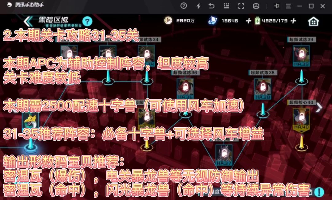 哈喽~大家好,我是和我约会呀今天给大家带来黑暗区域困难模式系列的36-40关详细通关保姆级攻略o(* ̄▽ ̄*)ブ黑暗区域困难模式36-40通关攻略关卡攻略:本期APC关键词-闪避(概率躲避控制与伤害)本期APC佩戴核心-缓回核心(生命值低于百分之70,每回合回复最大12%生命值)打不到还回血(╯▔皿▔)╯HA.36-HA.40:本期推荐数码宝贝:尼普顿兽(禁疗)+十字兽+输出型