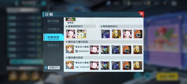 先贴图。二十五层天使图稍微比蔷薇难一丢丢,战力需求跟蔷薇差不多,但插件挺香的建议去21层刷插件(中附21层挂机配置)(后附超低战力逃课配置可跳看)阵容如下:十字兽及格条件:二万六命中即可海天使:及格条件:回馈插件即可黑暗战斗暴龙兽及格条件:二万七命中即可(比较稳)幻影加奥加bm及格条件:点上巨人杀手,输出高即可帝皇龙甲兽fm(可替成其他c)及格条件:输出高即可科技推荐:扛不