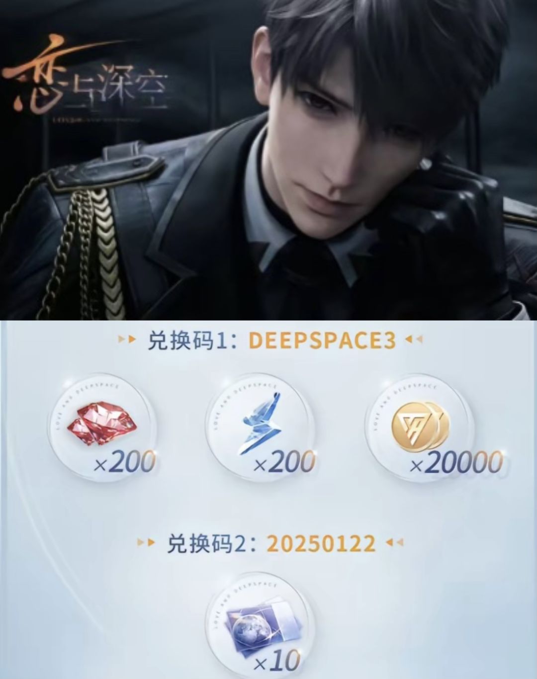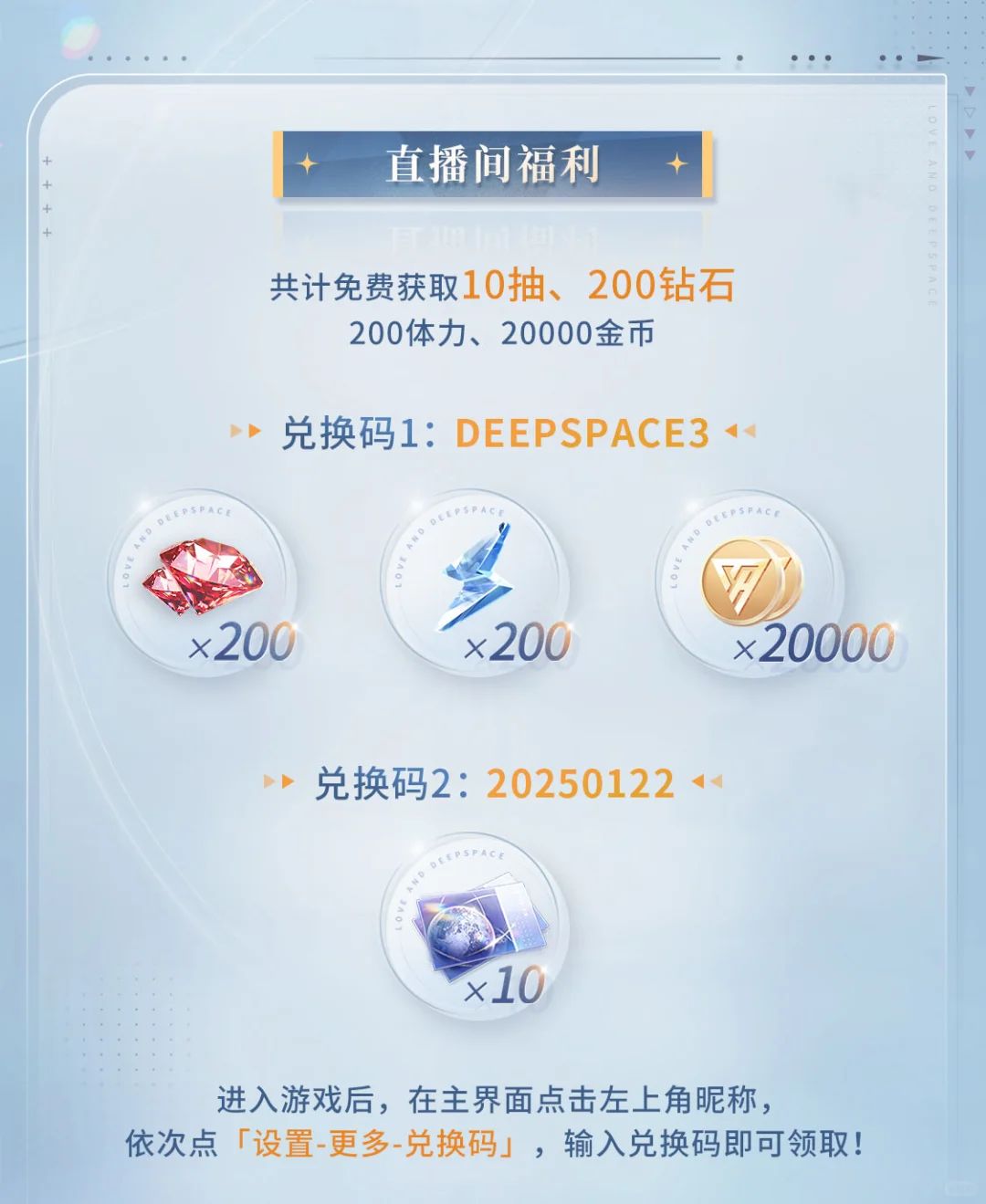 ✨ 兑换码1:DEEPSPACE3 粉钻*200,体力*200,金币*20000 ✨兑换码 2:20250122 蓝券*10 ✨ 进入游戏后,在主界面点击左上角昵称,依次点「设置-更多-兑换码」,输入兑换码即可领取! #恋与深空 #恋与深空攻略