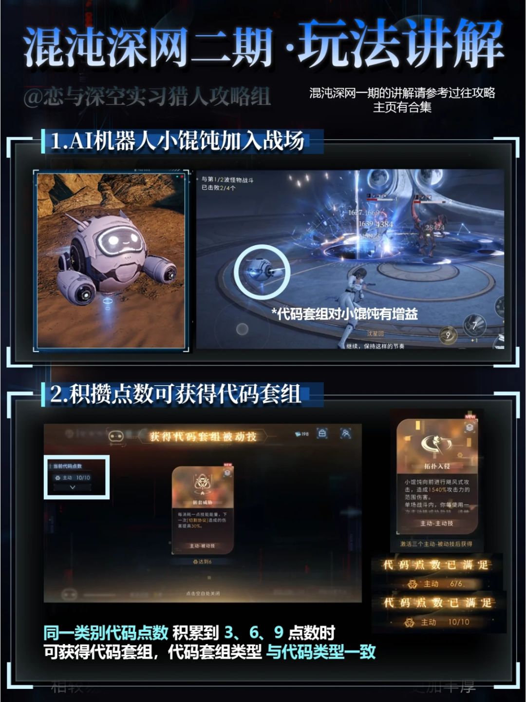 混沌深网二期1.22即将上线,本次结合直播+宣发图给大家先行讲解下新玩法部分 💡新玩法 - AI机器人小馄饨加入战场,可使用代码套组进行强化 - 新增了4种小游戏【踩格子/躲飞盘/横版闯关/123木头人】 - 新增了2种推演节点【密钥仓(理解成彩票机)/偶发危机(战斗关卡)】 - 商店内可以购买道具了,碰到了一定要买,提升收集速度,更快薅钻 💡代码部分 - 代码套组:积攒同一类别的代码点数到【3、