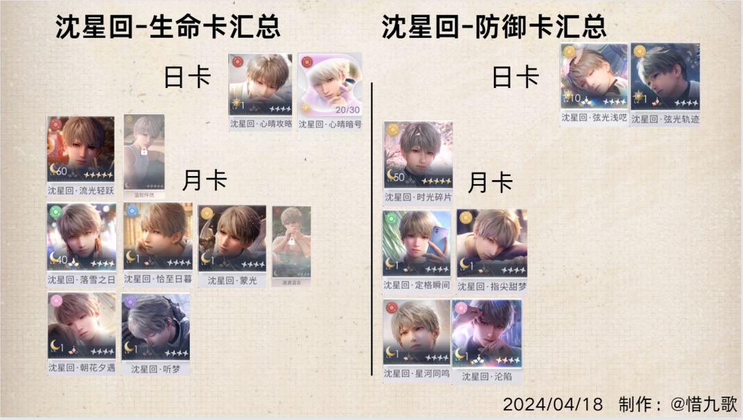沈星回生命/防御卡汇总+黎深攻击/生命汇总