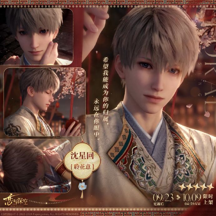 目光穿过熙攘人潮望向他时,他也正在看着你。 花瓣轻轻落在伞面,他在耳畔轻声祝福喜欢的人,心愿成真。 “希望我能成为你的归属,永远在你眼中。” 🏞欲揽旖旎色 9月23日更新后~10月9日上午4:59, 猎人可从限定五星思念「沈星回·聆花意」、「黎深·枕月眠」、「祁煜·画琳琅」、「秦彻·风临野」中任选3张,所选思念许愿概率限时大幅提升,占五星获取几率的75%。 *Tips: 1.所选思念可随时更换,未