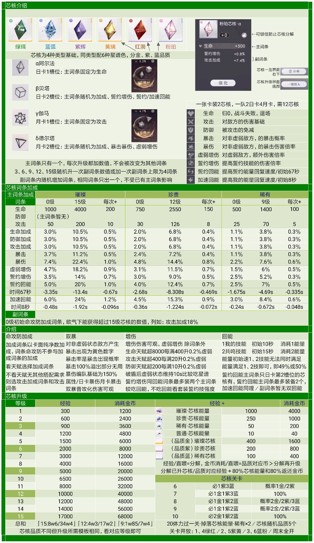 芯核有四种,其中属性的情况如下: 【芯核α】主属性固定为生命,副属性四条随机。 【芯核β】主属性可以是:攻击加成、防御加成、生命加成、誓约回能、誓约增伤、加速回能,副属性四条随机。 【芯核γ】主属性固定为攻击,副属性四条随机。 【芯核δ】主属性可以是:生命加成、攻击加成、防御加成、暴击、暴伤、虚弱增伤,副属性四条随机。 卡片有三种,分别是攻击卡、生命卡、防御卡,卡片的天赋是: 1、攻击:超过400