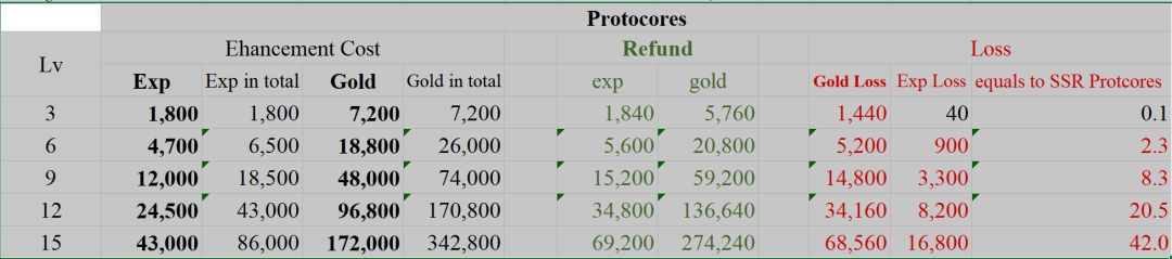 首先普及2个概念: 1. 芯核如果没用,分解是当前版本唯一的出路(但愿4.0版本允许副词条锁定和更换),而且包裹上限只有2千,刷几个月就要满(希望4.0版能大幅扩容)。 2.芯核强化每一阶的开销如下图,但实际花费是叠加累计的(已经列出);回收分别补偿经验和金币,其中经验计算公式为芯核本身经验(金色400,紫色-不建议升级,蓝色-建议一定不要升级)+累计花费经验的80%,金币计算公式为累计花费金币的