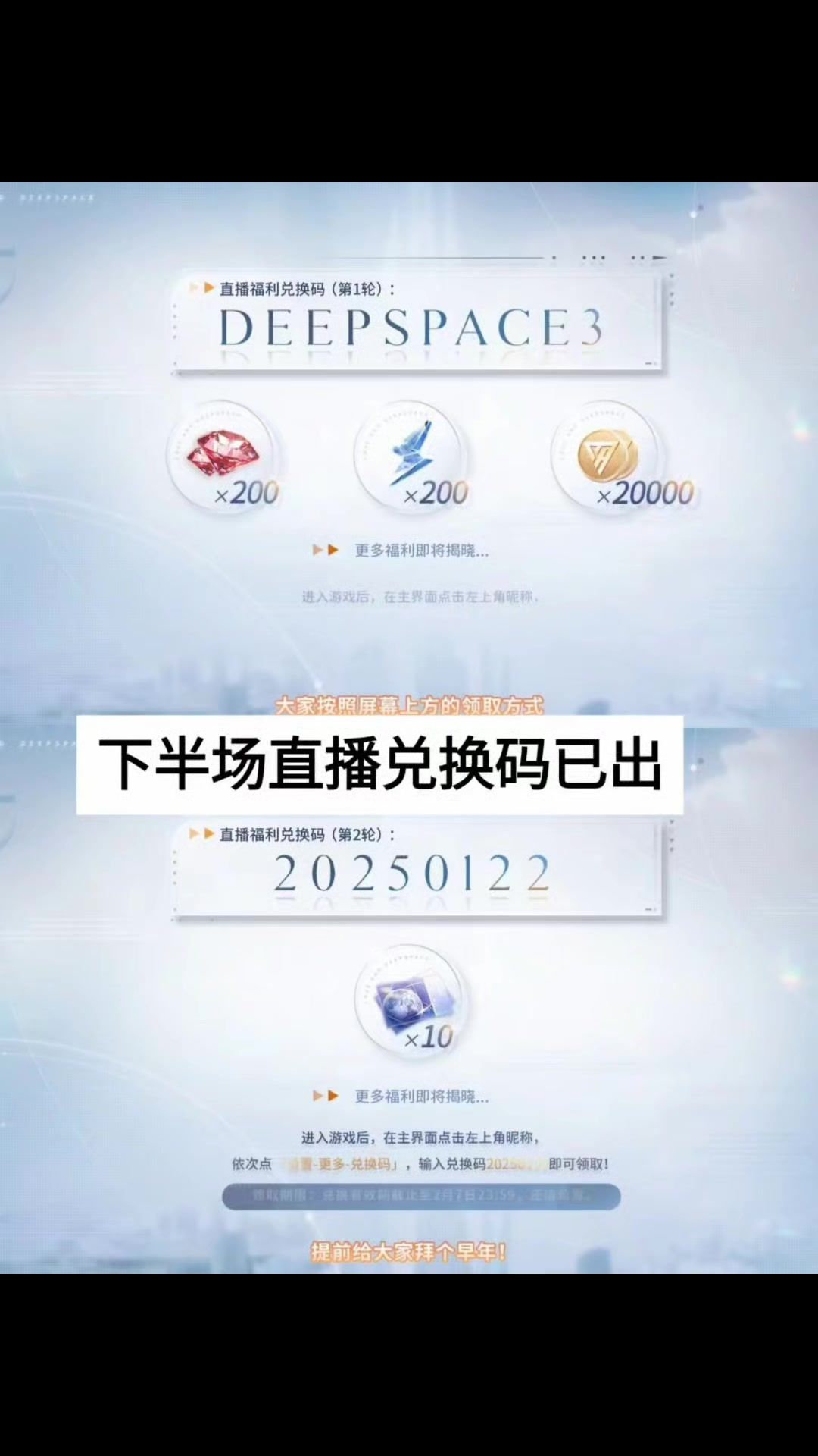 【兑换码】 ✨20250122 ✨DEEPSPACE3 【使用方法】 在游戏主界面 - 左上角昵称,设置 - 更多 - 兑换码 【兑换奖励】 ✨极空许愿券*10 ✨钻石*200、体力*200、金币*20000 【截止时间】 *兑换码有效期截至2025年2月7日23:59 #恋与深空万象遇你 #恋与深空攻略 #恋与深空兑换码 #恋与深空新版本