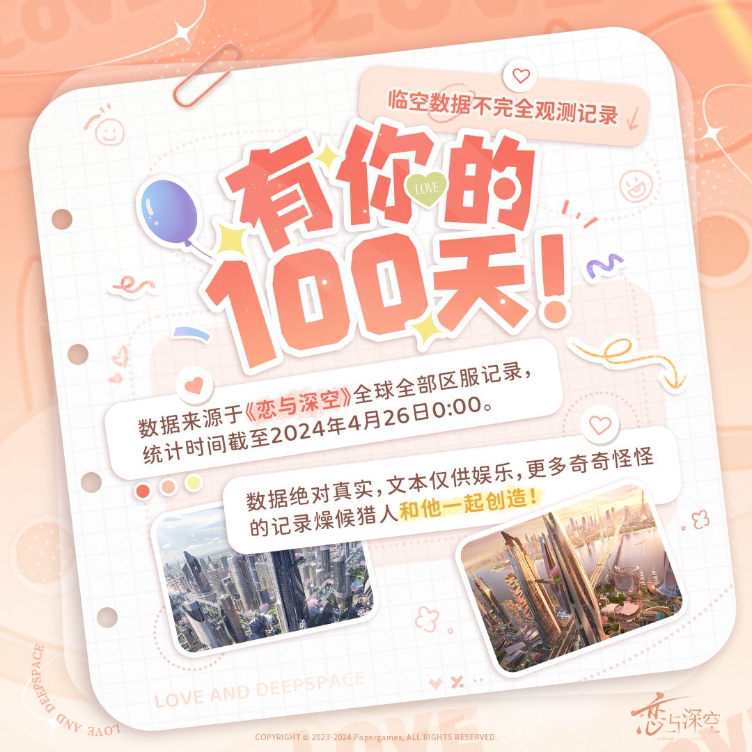 1、100DAYS ps:钻石*100、体力*100、金币*10000 *兑换有效期截止至5月31日23:59 2、KEEPLYSK (Keep联名) ps:「金的很厉害奖牌」贴纸奖励 *兑换有效期截止至 6月17日23:59 3、游戏界面右上角调查问卷 一张蓝券 #恋与深空兑换码 #恋与深空