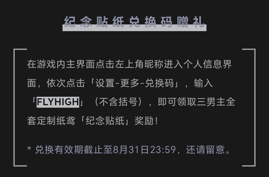 最新的兑换码 FLYHIGH 是纪念贴纸 兑换码有效时间到:8月31日23:59 (也可以在评论区复制粘贴哦) #攻略 #最新兑换码兑换码