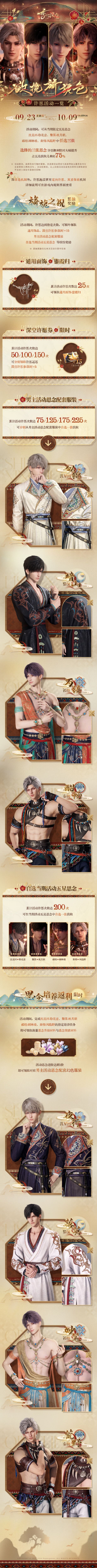 🏞活动时间:9月23日更新后~10月9日上午4:59 🏞活动说明 1.活动期间,猎人可从限定五星思念「沈星回·聆花意」、「黎深·枕月眠」、「祁煜·画琳琅」、「秦彻·风临野」中任选3张,所选思念许愿概率限时大幅提升,占五星获取几率的75%。 2.所选思念可随时更换,未选择活动思念与其余常驻五星思念均分五星获取几率的25%。 3.活动结束后,四张活动五星思念将暂无获取途径,不会进入常驻许愿极空回响。 🏞
