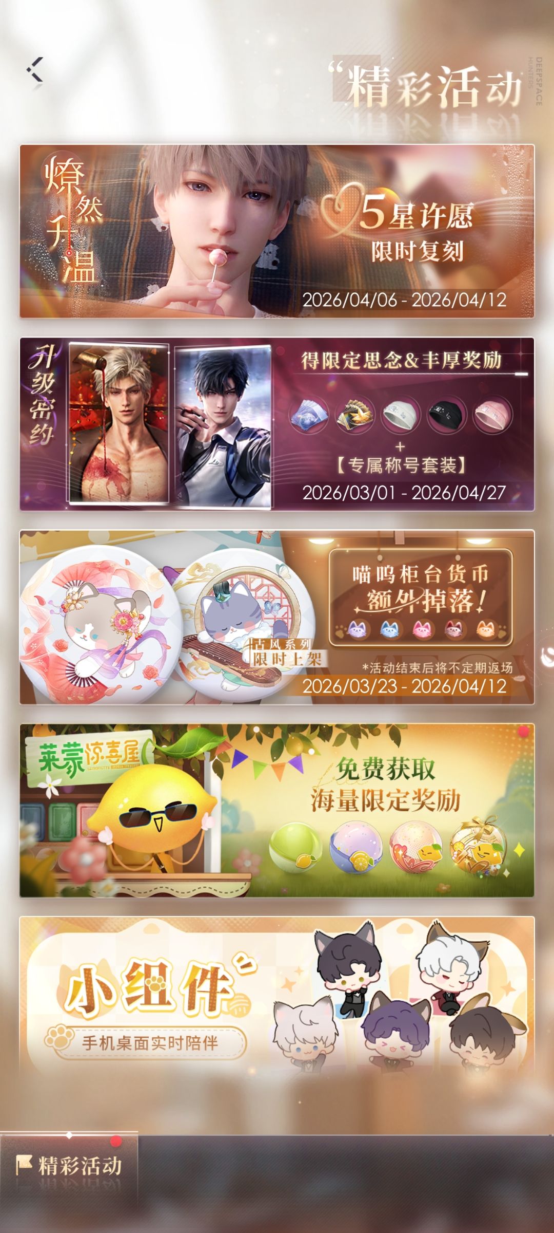 活动时间:2月10日更新后~2月27日 活动说明 1.活动期间限定五星思念有「沈星回·虚构妄想」、「黎深·即时紊乱」、「祁煜·狂热剂量」、「秦彻·无罪樊笼」、「夏以昼·附骨之痕」 累计活动许愿达25次,可领取通用面饰「银刃狂想」; 累计活动许愿达50、100、150、250次时,可分别领取「深空许愿券·限时*5」的许愿返还; 累计活动许愿达75、125、175、225、275次时,可分别从当