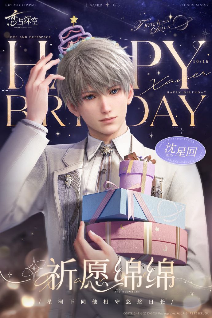 参与活动,体验专属庆生剧情。更有生日限定思念、日常服装、「深空许愿券·限时*20」等缤纷奖励等你获取! 🍰活动时间:10月11日上午5:00~10月18日上午4:59 🍰银河摇曳:生日五星思念限时UP许愿 活动期间,限定五星思念「沈星回·星辰有信」许愿概率限时大幅度提升。 *活动结束后,本张思念将暂无获取途径,不会进入常驻许愿极空回响中。 Tips:许愿池设置有双重保底机制,详细说明可在游戏内活动