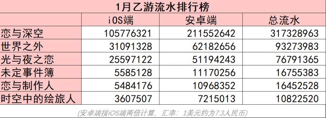 2025年1月乙游流水榜出炉《恋与深空》领先