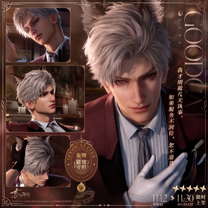 “可爱”不是某些猫的舒适区,但他愿意配合你演练。 一碰就送到手心蹭蹭的条件反射,猫的弱点已经被你掌握。 “我才刚做几天执事。如果服务不到位,恕不退货。” 🐈遵命,饲养官 11月12日更新后~11月30日上午4:59, 猎人可从限定五星思念「沈星回·茸毛攻势」、「黎深·耳尖沉溺」、「祁煜·摇尾时刻」、「秦彻·猫德守则」中任选3张,所选思念许愿概率限时大幅提升,占五星获取几率的75%。 *Tips: 1
