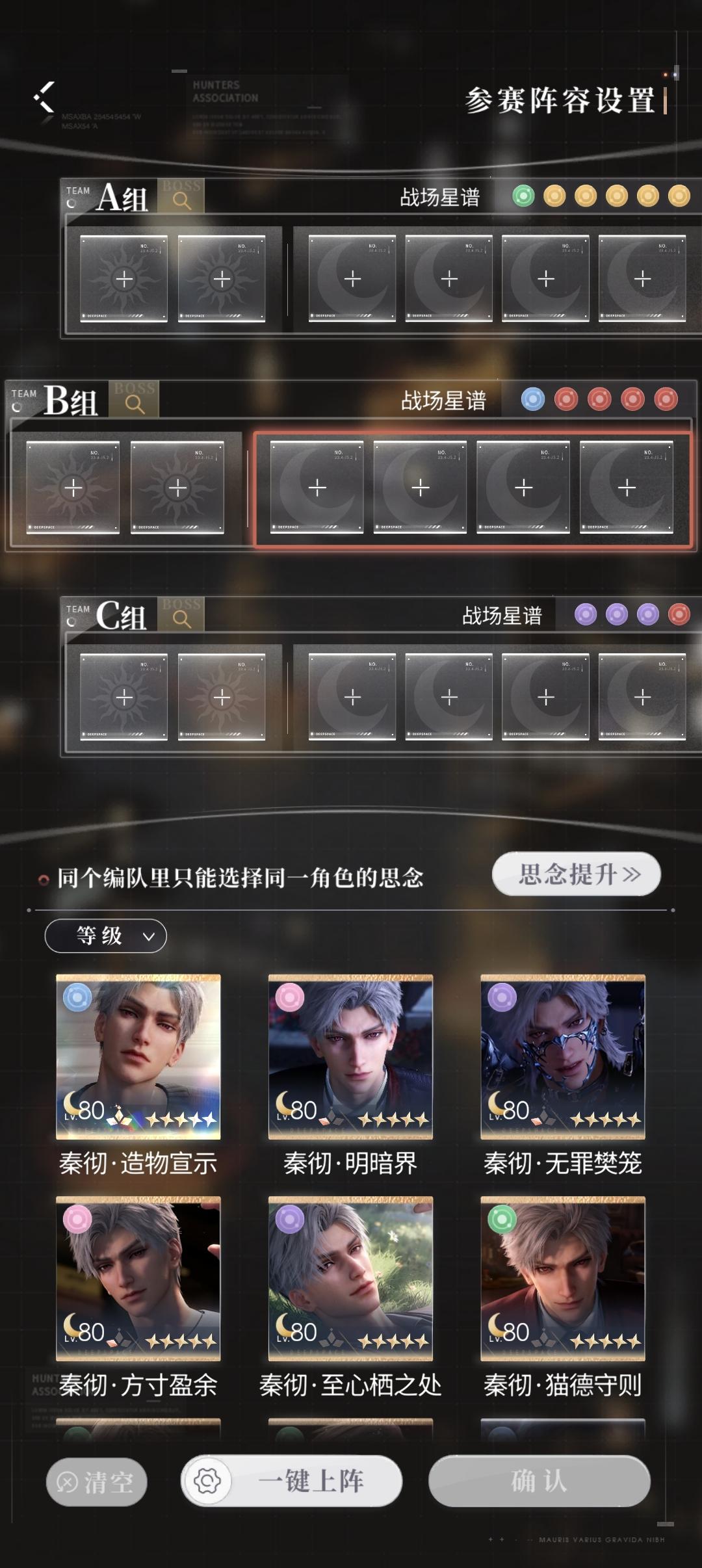 无隙之间,沦陷于你。 🤍2024年12月31日更新后~2025年1月20日上午4:59, 猎人可从限定五星思念「沈星回·雾色勾勒」、「黎深·零下沸点」、「祁煜·潮间带」、「秦彻·潜入夜」中任选3张,所选思念许愿概率限时大幅提升,占五星获取几率的75%。 *Tips: 1.所选思念可随时更换,未选择活动思念与其余常驻五星思念均分五星获取几率的25%。 2.活动结束后,四张活动五星思念将暂无获取途径,