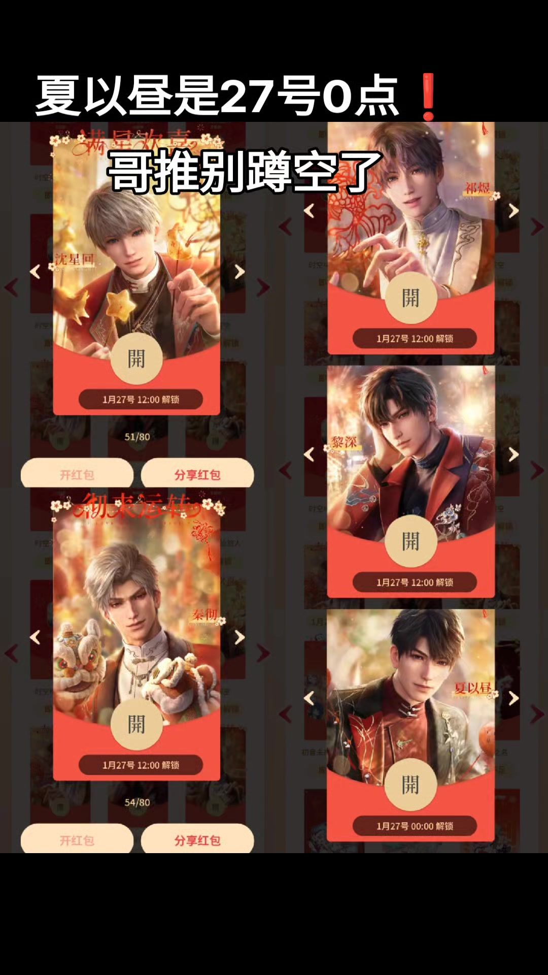 #恋与深空 活动时间: 2025年1月24日17:00 ~ 1月27日16:59 每日17:00起,限量发放。 2025年1月24日17:00 2025年1月25日17:00 2025年1月26日17:00 领取方式见图3 ⚠️每名微信用户仅可领取一位恋与深空男主的红包封面,领取完成后不可更换,且无法领取其余四位男主的红包封面。 #恋与深空一周年 #恋与深空万象遇你 #恋与深空攻略 #致爱