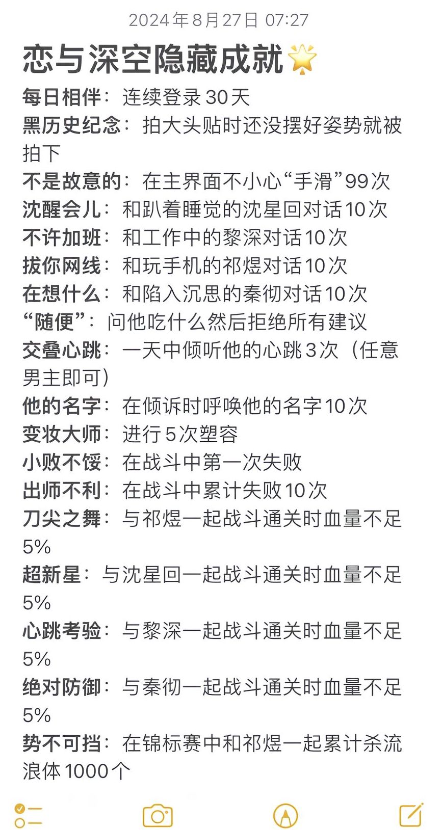 灵空行动成就合集:2个隐藏成就+25个普通成就#恋与深空 #恋与深空攻略 ps:水印是我快手号,非盗