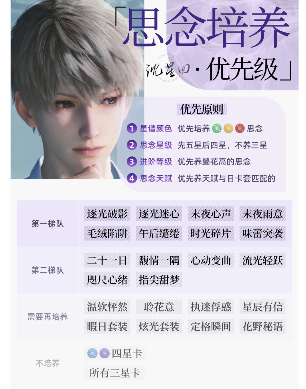 食用方式限定卡和常驻卡都排在了一起未拥有的卡直接往 顺延即可2(第一梯队)培养至50级觉醒或60级之后就要开始刷芯核了再往后养卡的提升效率不如刷芯核。芯核关6就开 始掉金色芯核了但6、7关掉落概率太低不要投入资源 刷刷到能用的强化+3+6之后尽量往后打 3(第一梯队)(第二梯队)是爬塔的常用卡(需要再培养) 的卡用得不多但也会用到如果资源吃紧可以先不培养 用到再拉 但一般常驻卡的进阶等级要比限定卡