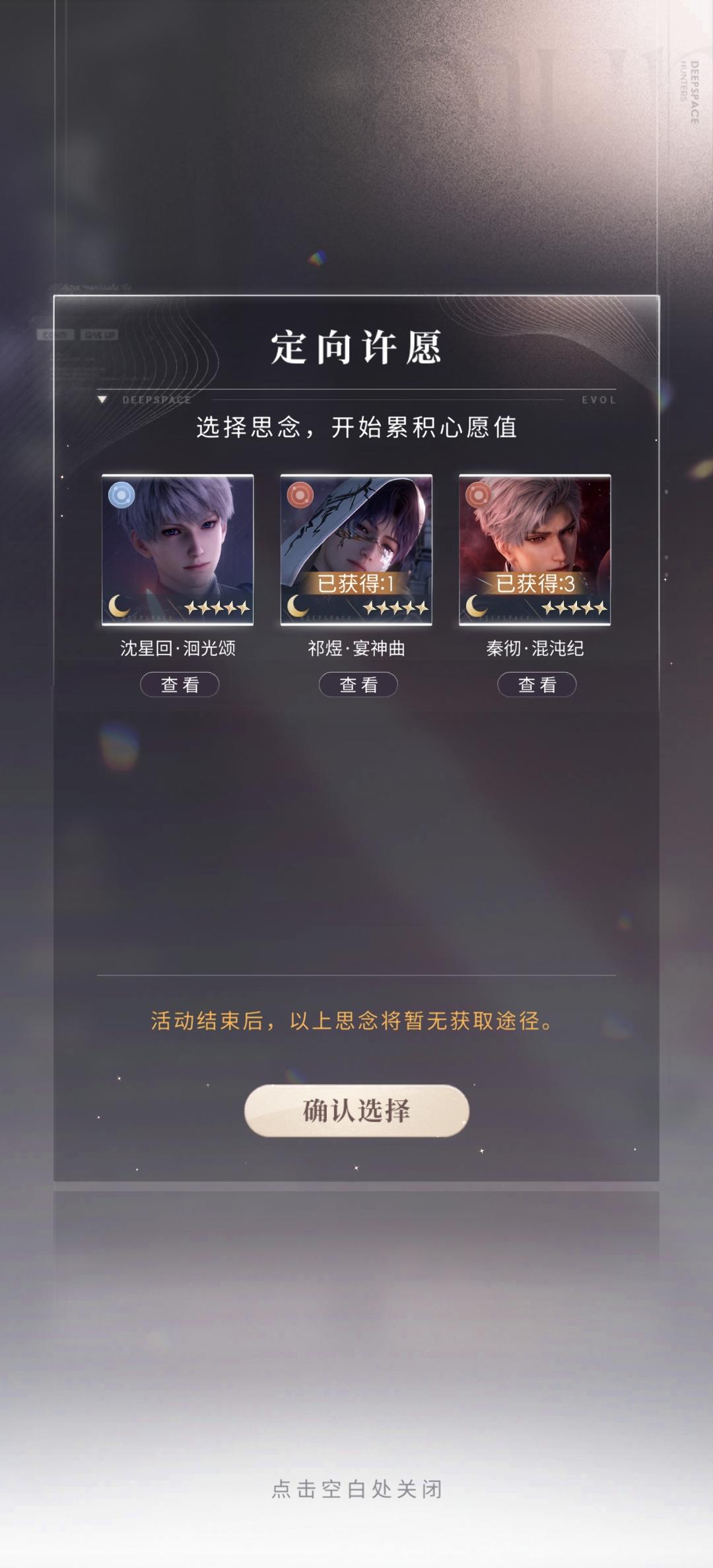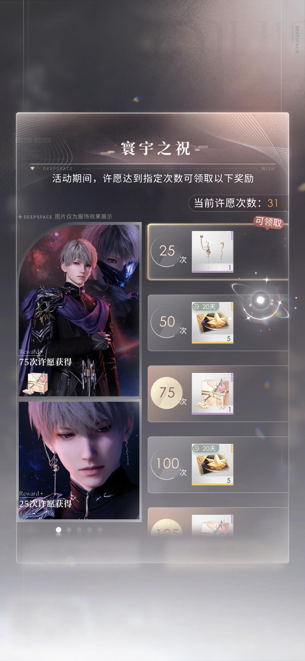 盛典即将启幕,银河静候为你加冕。>>>5.0丰厚福利全总结12月31日起,含直播十连在内,参与活动共计可免费领取「✨40连抽、游戏内花园独栋别墅*1、五星思念*1、四星思念*6、海量钻石」及专属牵绊装扮、“我”的服装、多款饰品、写真特效、丰厚培养材料等豪华福利!>>>缤纷活动全掌握💫「爱,宇宙,诗王座」五星限时UP许愿✨「首充加赠」重置、「周年臻享」及系列礼包上架,详情可在更新后前往游戏