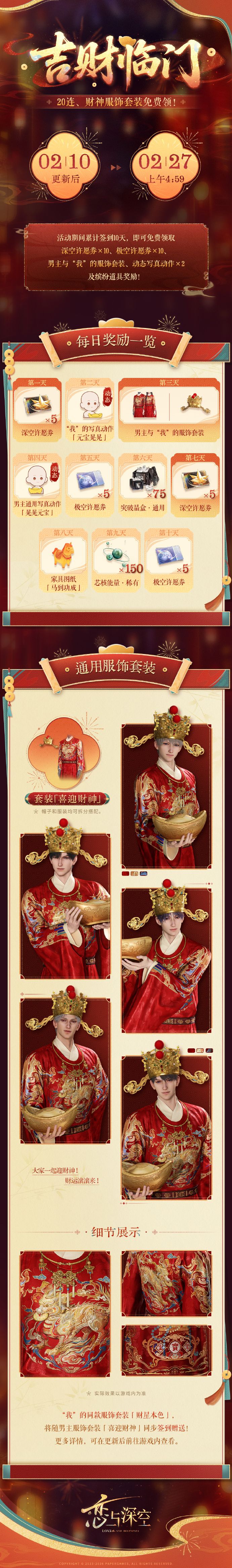 「吉财临门」福利活动即将开启,与他共迎新春佳节;累计签到,免费领取20连、全新财神服饰、动态写真动作等缤纷奖励!💫活动时间:2月10日更新后~2月27日上午4:59🧧财神服饰套装男主通用服饰套装「喜迎财神」、“我”的同款服饰套装「财星本色」——累计签到3天,即可免费领取。*套装内包含帽子与服装,均可拆分搭配。🧧动态写真动作✨“我”的动态写真动作「元宝晃晃」——累计签到2天,即可免