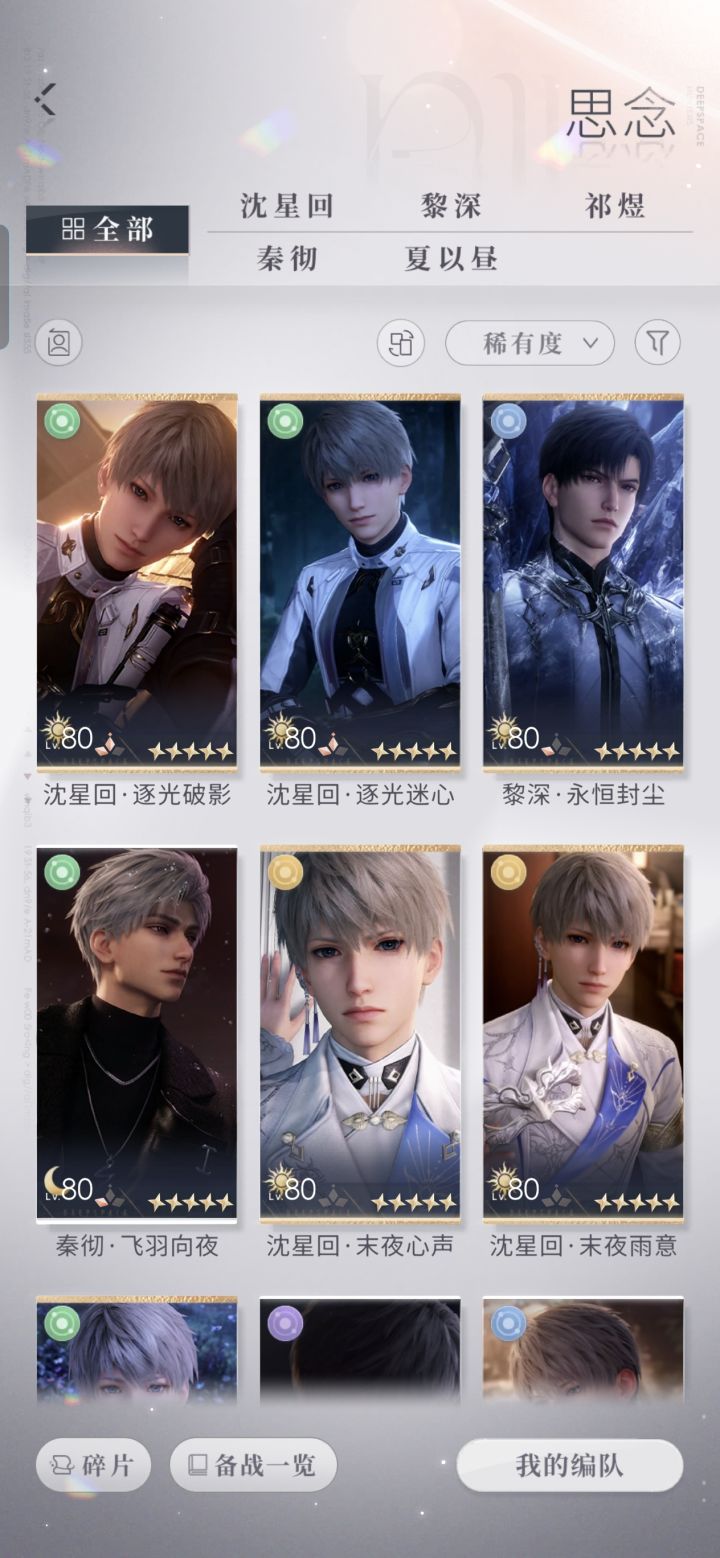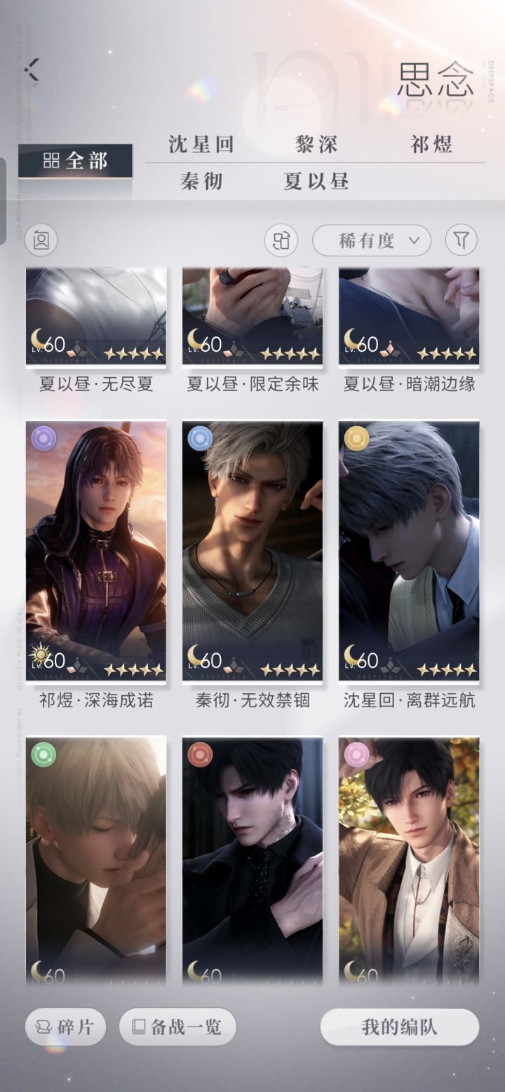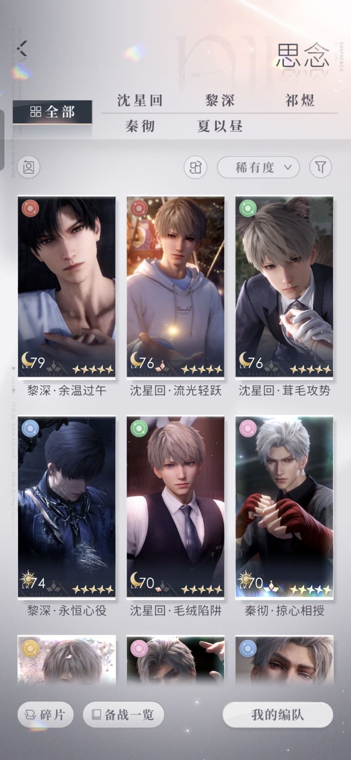 求各位夫人们帮忙估号自建号,应该是龙彻那会入坑的,鱼推,祁煜三套日卡都有,深海满花,限日一阶,小海神还有一个盒子没开,零阶深渊,零阶光猎,其他三个都只有常驻日卡。氪条两千多,三档年卡都买了,有红底照。#恋与深空