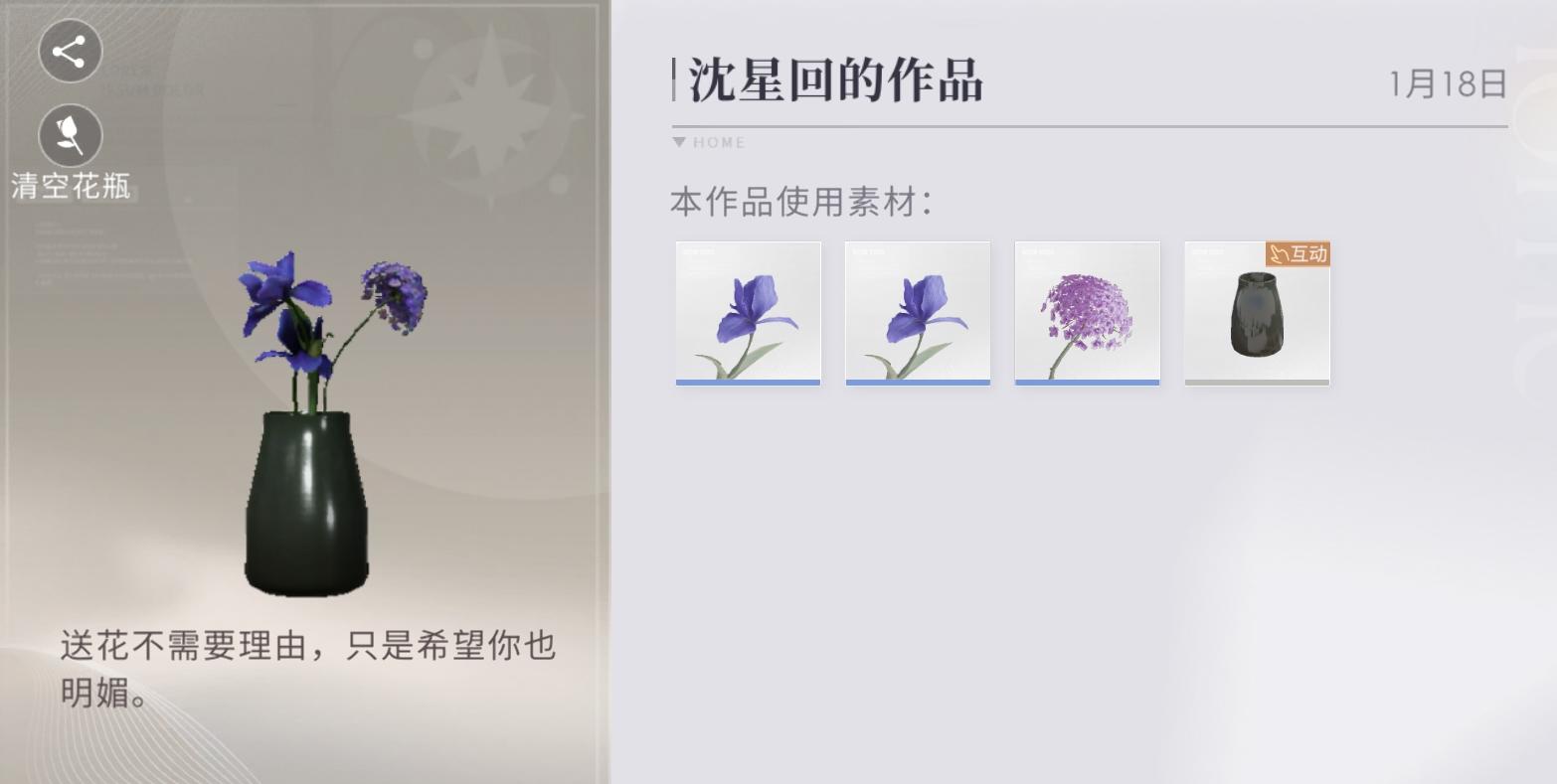 今天开了12倍速玩家园,没想到收到了沈星星的花(图一)!虽然样子丑了点,但花语很动人~图二也是沈星星插的🤭从系统的角度来讲,是我俩共同的作品,但实际上,我只起到了点击保存的作用🤣这瓶花配色、插法都好优雅,特别适配这个花瓶!我喜欢得不得了,直接存模板了,下次偷懒就用它😁