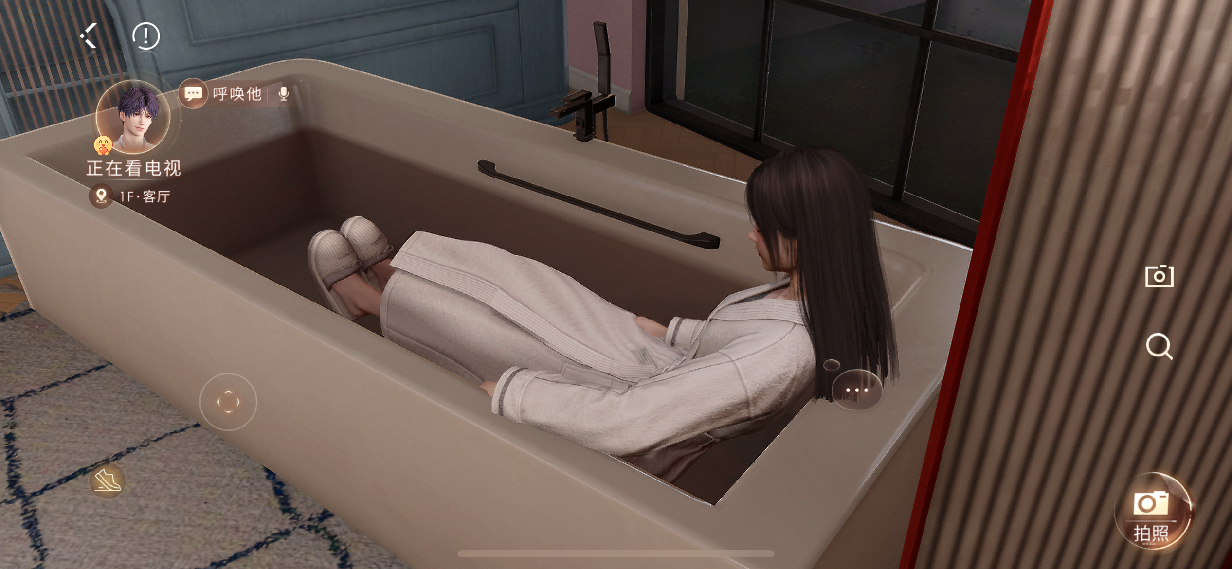 别的家园游戏,要么穿泳衣泡,要么裹浴巾泡,这边穿着浴袍还要穿拖鞋,看着好难受,泡起来都不舒服了! #恋与深空 #恋与深空家园