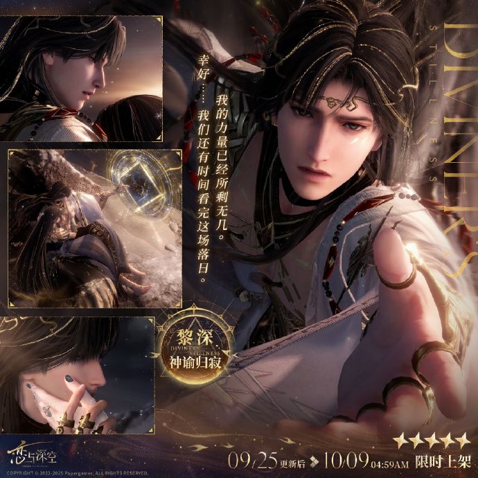 参与活动,即可免费获取四星日冕套装思念「黎深·终序永劫」、「黎深·终序牵怀」、三星思念「黎深·终见」、「深空许愿券·限时*10」、「钻石*500」、「拍照动作*3」、限定称号等缤纷奖励!