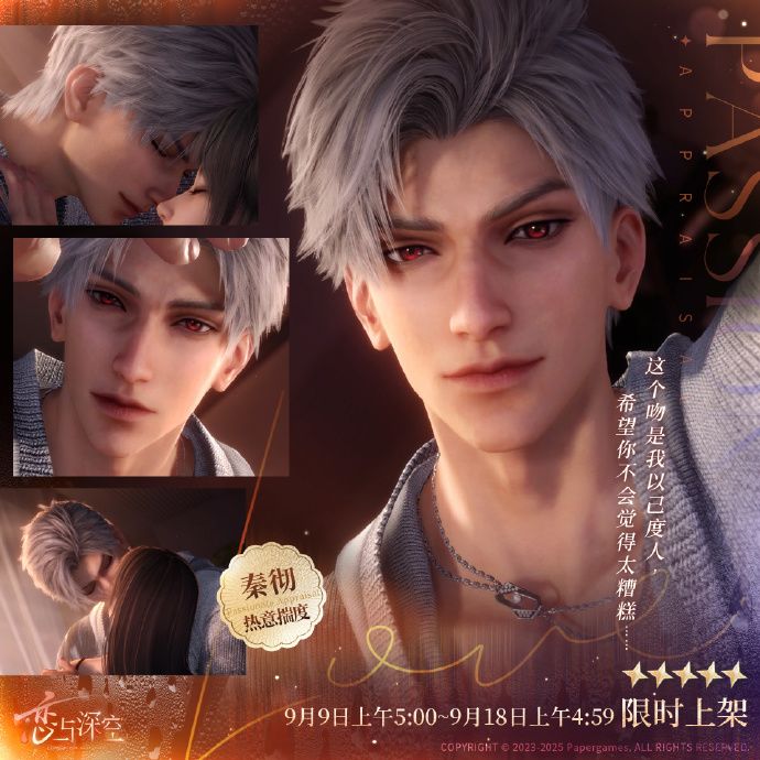 烧得迷迷糊糊的脆弱时刻,想念的人忽然就出现在眼前。安心窝在他的怀中吧,想要撒娇、想被照顾……他都会听你的。💫五星思念限时UP许愿9月9日上午5:00~9月18日上午4:59,限定五星思念「秦彻·热意揣度」许愿概率限时大幅度提升。*活动结束后,本张思念将暂无获取途径,不会进入常驻许愿极空回响中。———跨越光年,与你并肩。《恋与深空》4.0版本「于深空见证的」现已开启!🪐点击下载: