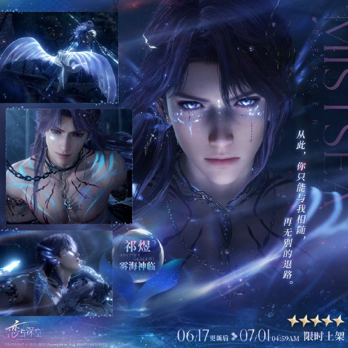 海神的新娘,请听——有歌声穿过凛冽的海风和倾颓的残垣,和你遥遥应和。鱼尾、侧腰、脖颈……亲手斩断束缚,解救你沉睡于此的神明。“从此,你只能与我相随,再无别的退路。”💧「当海湮没于海」五星套装思念6月17日更新后~7月1日上午4:59,五星日冕套装思念「祁煜·雾海神临」、「祁煜·雾海离歌」开放获取。累计活动许愿次数达100次(含第100次)前,每许愿10次可领取「深空许愿券·限时*1」的许
